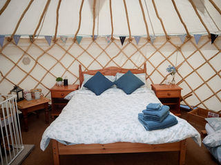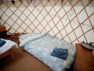Our cosy yurts are 5m in size sleeping up to two people perfectly, but can also be comfortable for a small family of four. Each yurt has a double bed, with a futon sofa, or two single chairs that convert to beds. They all have similar furnishings and decorated individually to a colour scheme. All of our yurts are fitted with clear view ceiling windows, perfect for stargazing